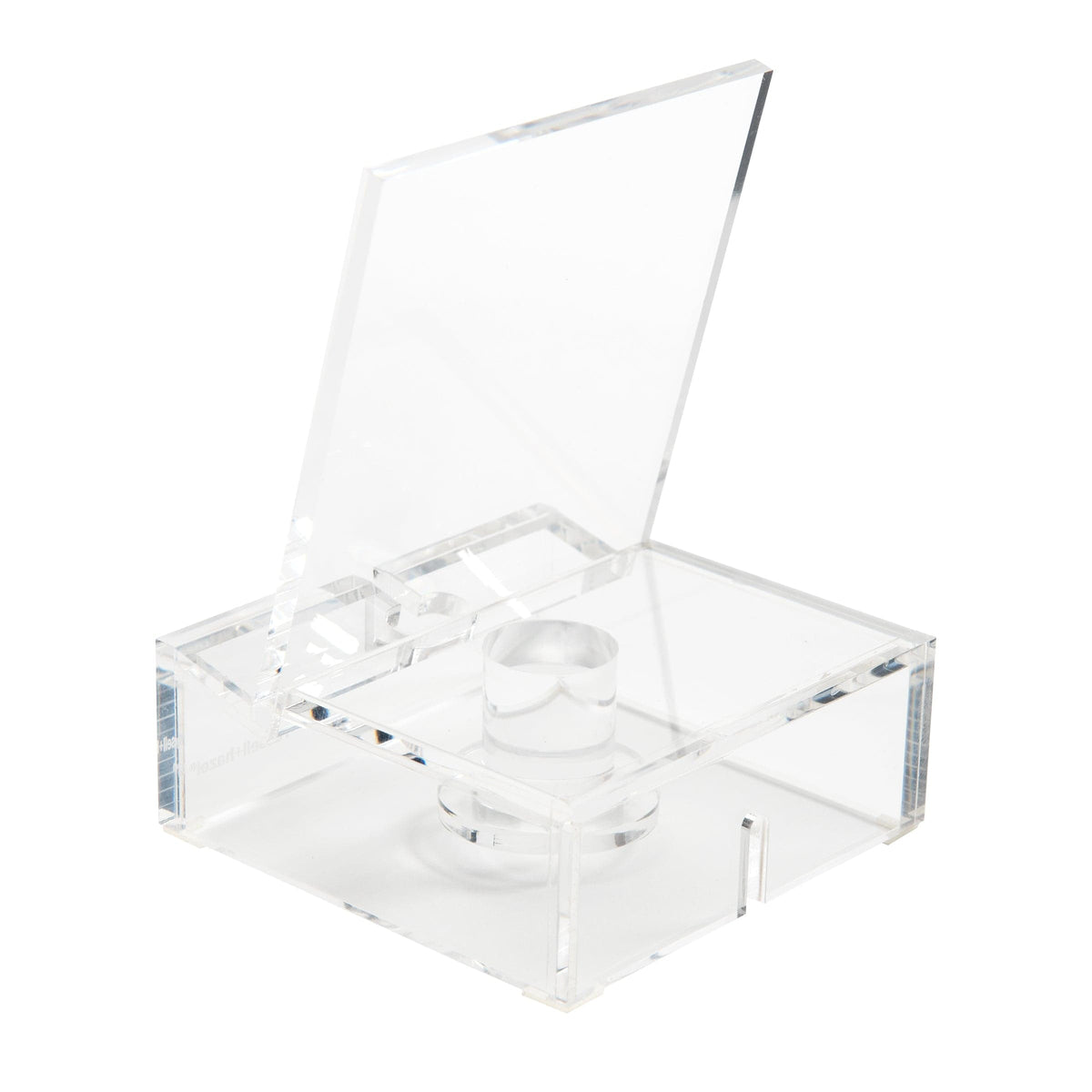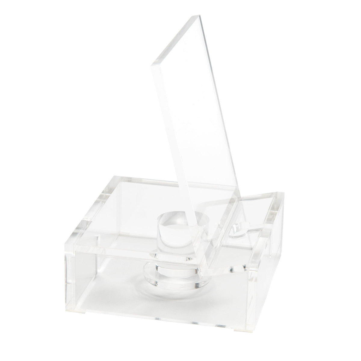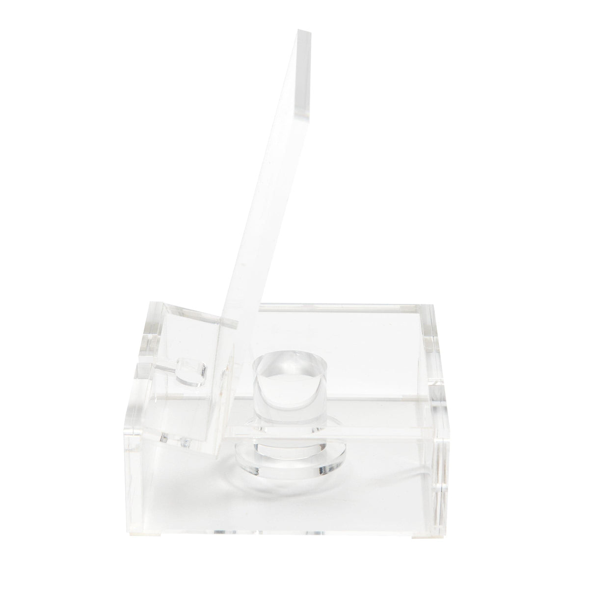 Keep your phone on display with the 4” x 4” x 5.5” acrylic phone dock. The chic modern design elevates your desk by accommodating several phone sizes as well as a charging cord manager. Hard cast acrylic is durably constructed with finely polished edges. Excellent to use on its own or as a coordinating piece in an entire system, this phone dock perfectly integrates with the pieces in our Stackable Bloc collection, including our acrylic bloc tray and acrylic bloc.