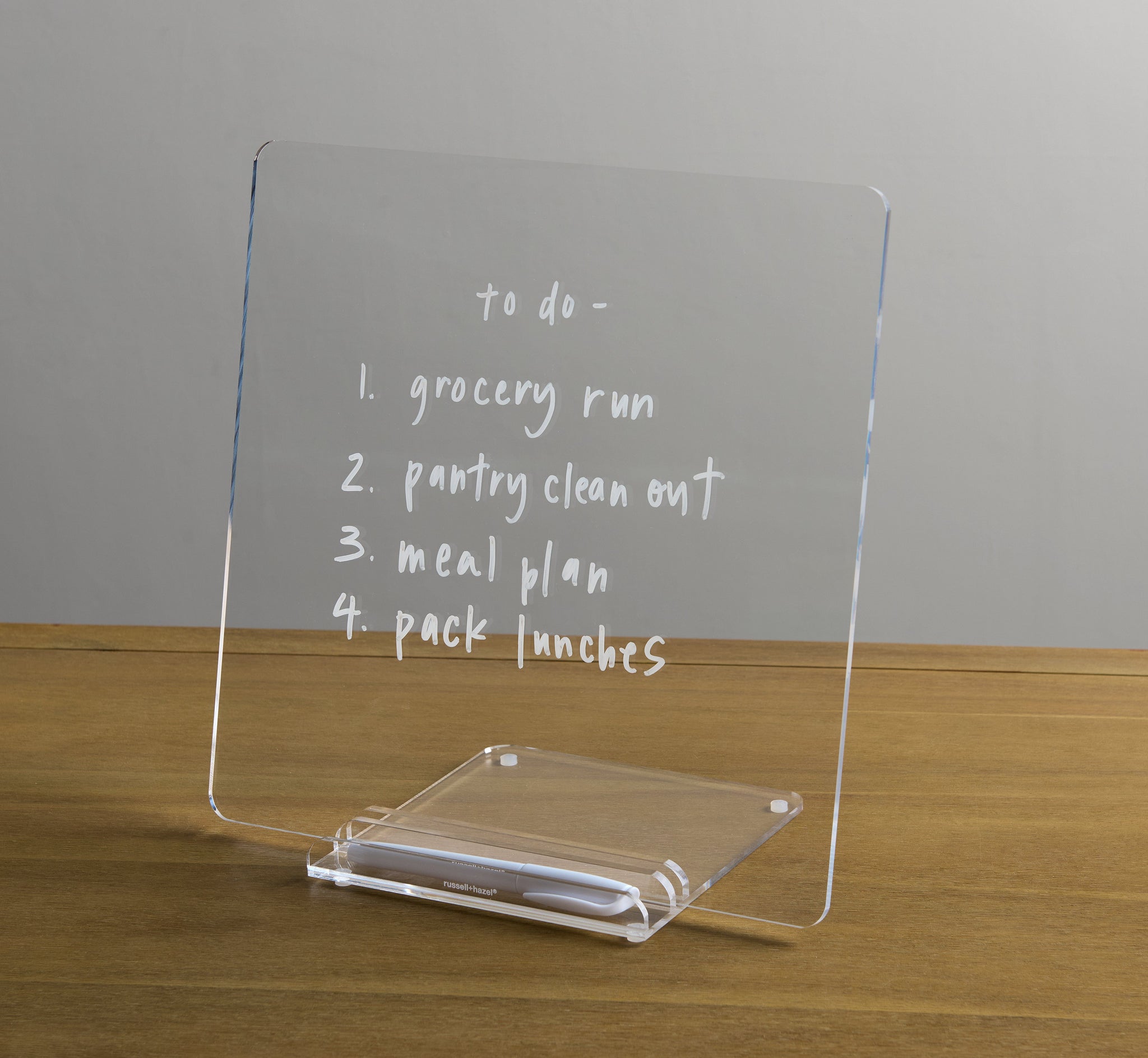 Keep your home and office organized with the russell+hazel Fine Line Acrylic Memo Board, a versatile dry erase board designed for everyday use. Measuring 12" x 6.5" x 12", this clear acrylic board is crafted from thinner, high-quality acrylic while maintaining the same premium durability and modern design you expect from the russell+hazel brand. Perfect for jotting down family notes, office reminders, appointments, grocery lists, or even welcome messages for guests, it serves as a functional centerpiece for any command center. The included dry erase marker makes it easy to write, erase, and reuse repeatedly, keeping your space clutter-free while adding a sleek, contemporary touch.