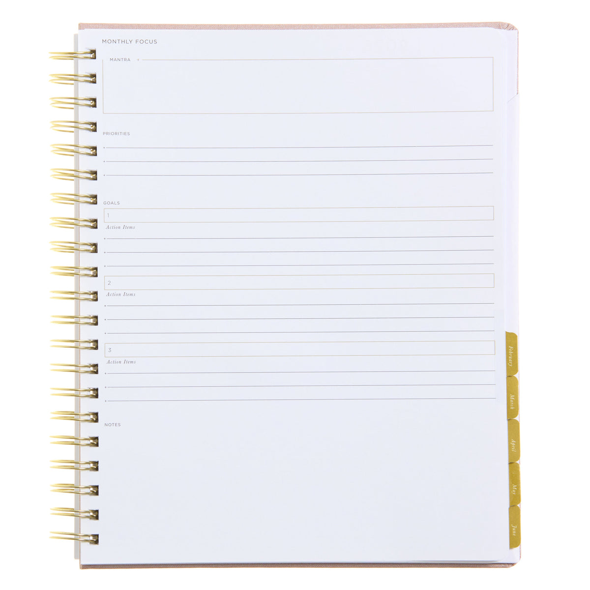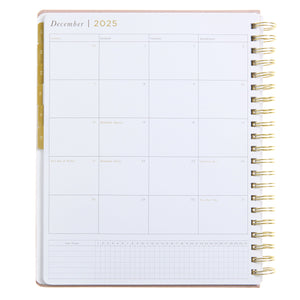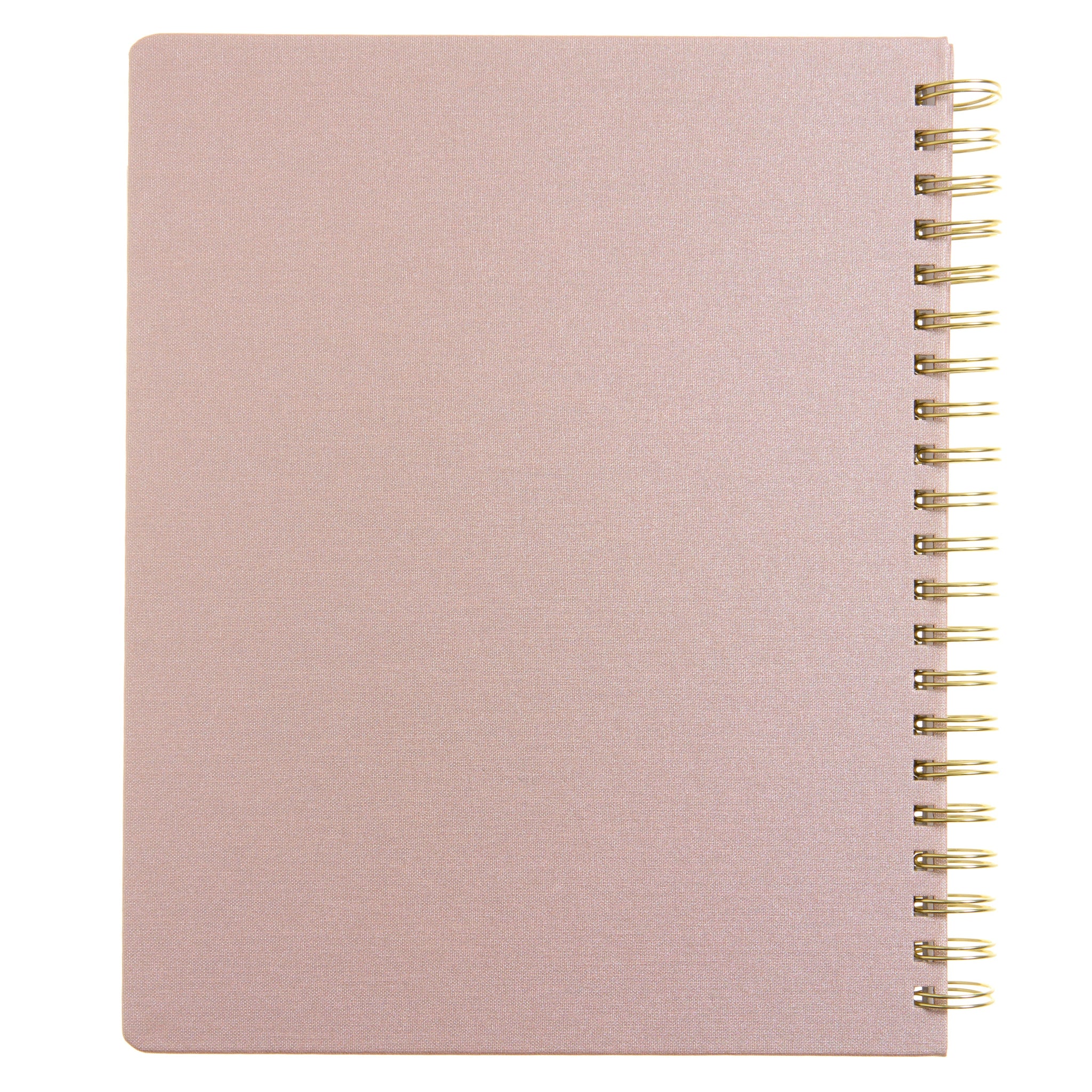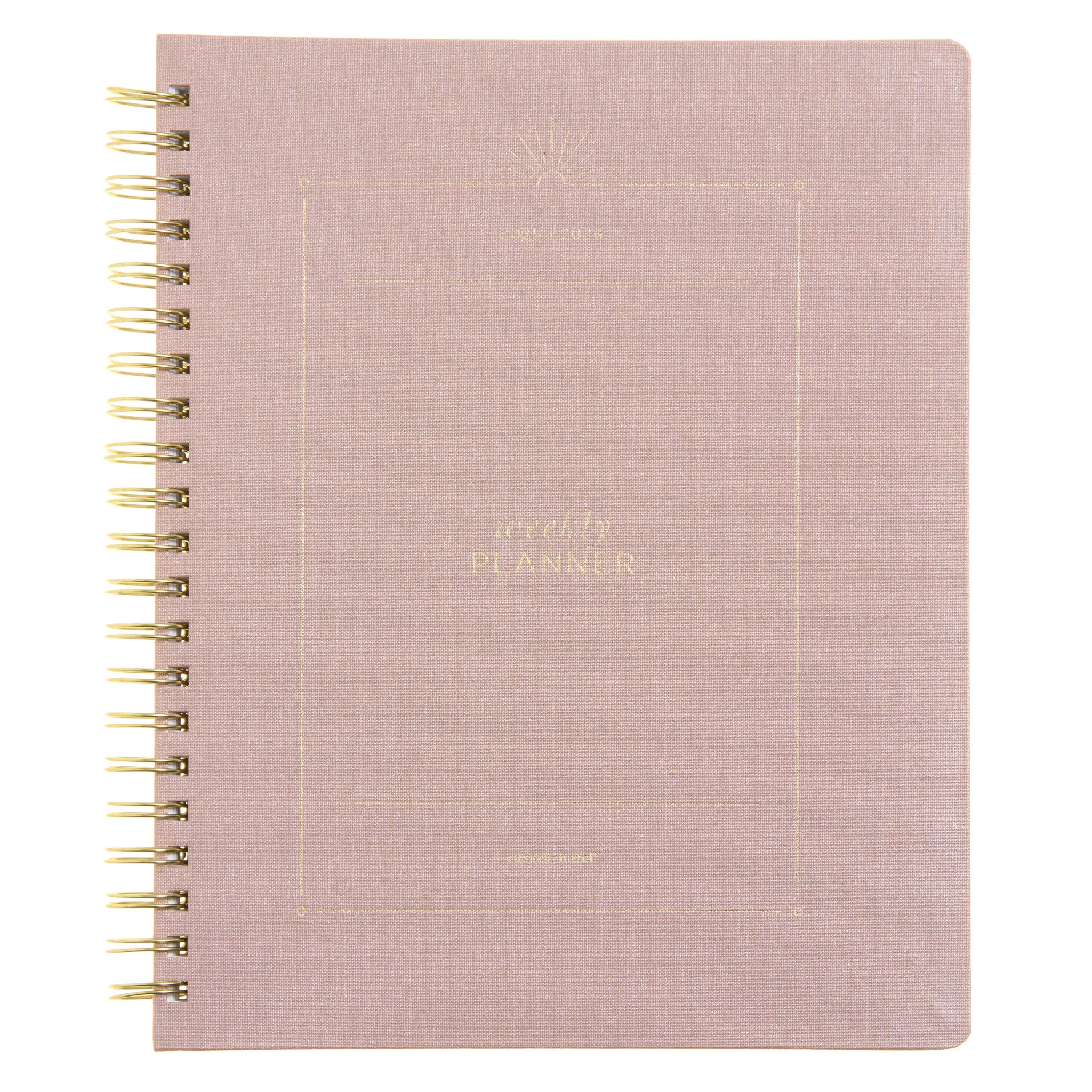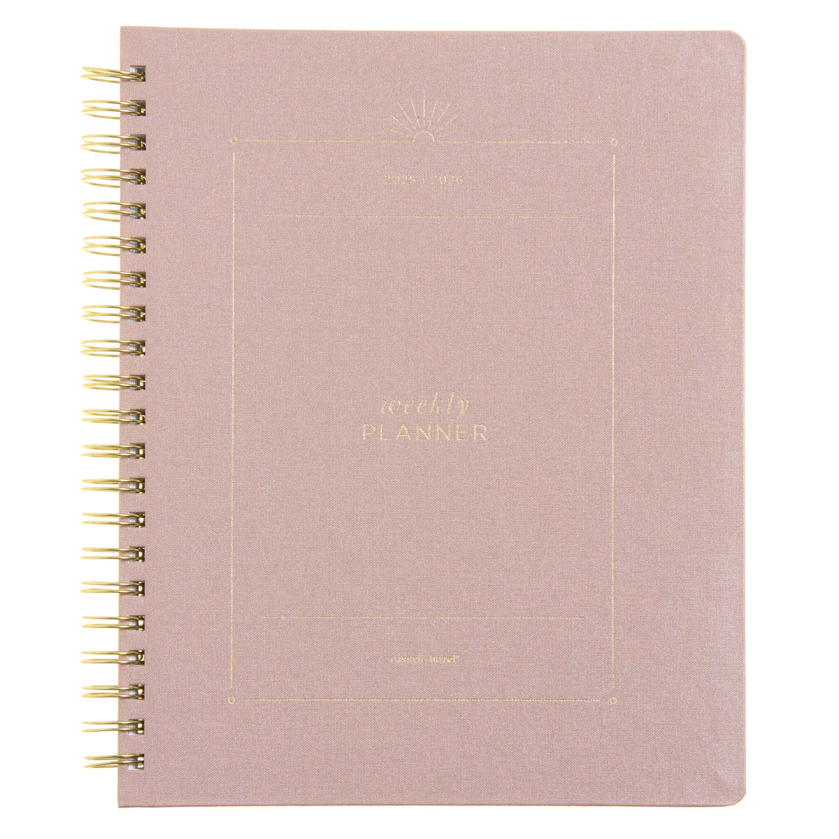 Introducing the 2025-2026 Weekly Planner - Gold Spiral Blush Bookcloth, your indispensable companion for navigating the year ahead with confidence and style. Designed for those who value both functionality and elegance, this planner is your go-to tool for staying organized, setting meaningful goals, and reflecting on achievements.Gold foil details on the blush bookcloth cover is your ultimate companion for an organized and successful year. This meticulously designed planner spans July 2025 to June 2026, with three bonus months for an extended planning horizon. It's not just a planner—it's your roadmap to productivity and success. Each weekly spread offers ample space to jot down daily tasks, appointments, and reminders. No more cramped, hard-to-read entries. With dedicated sections for each day, you can keep your schedule clear and concise. The monthly spreads are where the magic happens. Plan out your month with generous sections for goal setting and reflection. Track habits, note important dates, and set reminders easily with a clean and intuitive layout. Plus, references to previous and upcoming months ensure you're always in the loop. Set meaningful goals that align with your personal life, career, or finances. Use the monthly and yearly goal sections to map out your aspirations and track your progress. At the end of each month, reflect on your achievements and identify areas for improvement. Also includes pocket folders in the back of the planner. This planner helps you not only plan but also grow.
