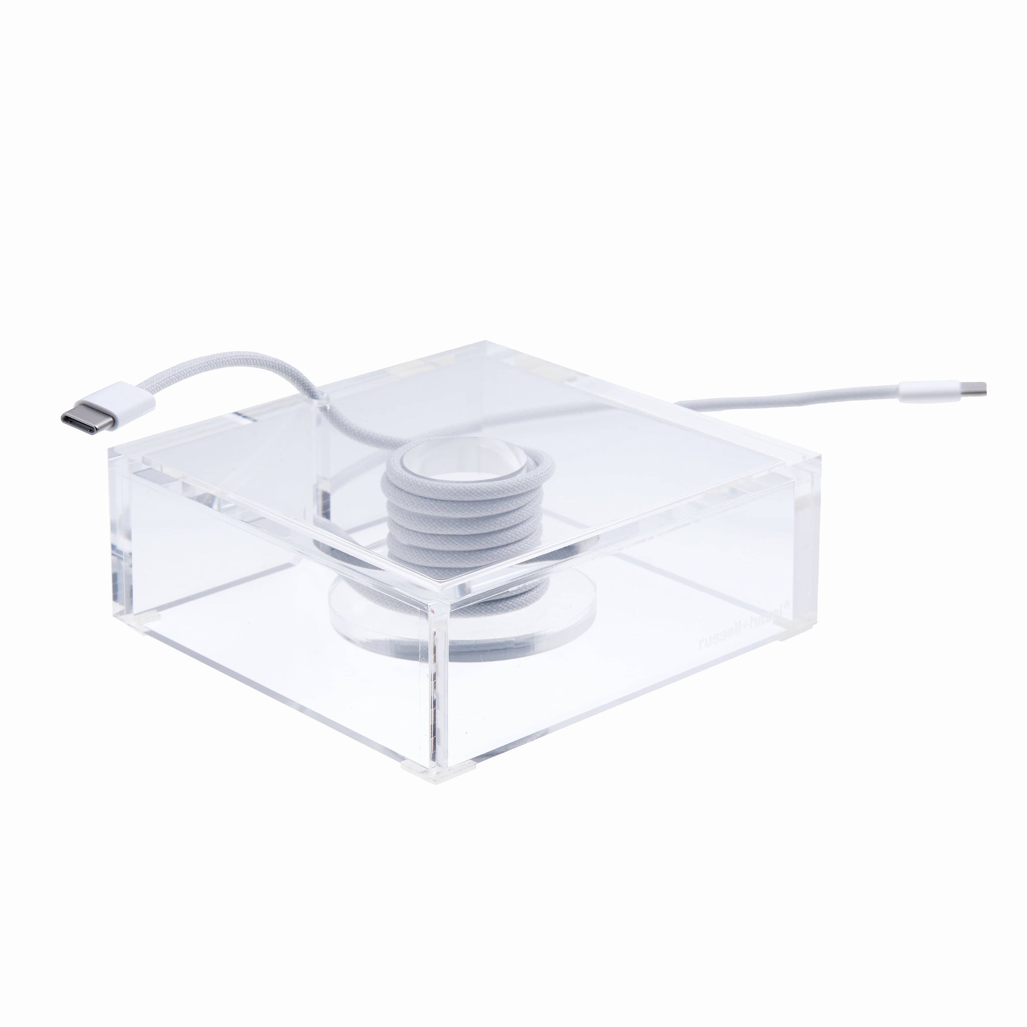 Organize your workspace with precision and style using our sleek Acrylic Cable Organization Bloc. At a compact size of 4 x 4 inches, this cord management bloc is meticulously designed for effortless organization of essential cables, such as your charger and headphones.