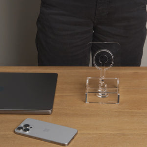 In a world where efficiency and sleek design are paramount, the Acrylic Phone Bloc stands out as the quintessential companion for modern tech enthusiasts. Merging functionality with an artful aesthetic, this phone bloc revolutionizes how you interact with your devices, ensuring they're always charged, accessible, and elegantly displayed. Crafted from premium acrylic, boasting dimensions of 4 x 4 x 6.875 inches. Its transparent nature not only adds a touch of sophistication to your workspace or nightstand but also allows it to blend seamlessly with any décor. Designed with your needs in mind, the bloc features an angled platform, providing the perfect angle for video calls, watching multimedia, or keeping an eye on notifications without lifting the phone. Beneath the sleek exterior lies a thoughtful cord keeper. This design innovation ensures that your charging cable is neatly organized and always within reach, eliminating clutter and keeping your space tidy and efficient. This ergonomic design enhances your interaction with your device, whether at work or during leisure.