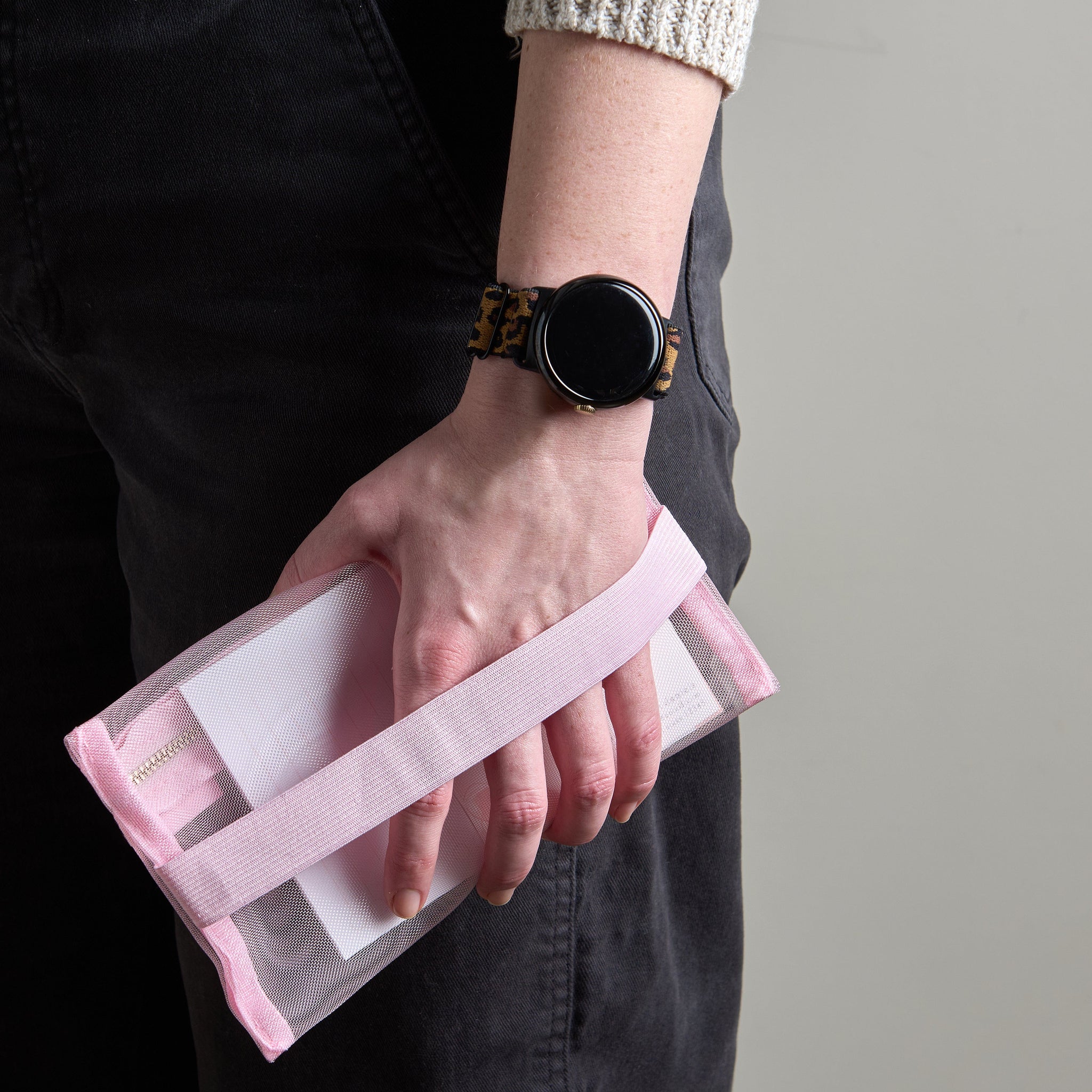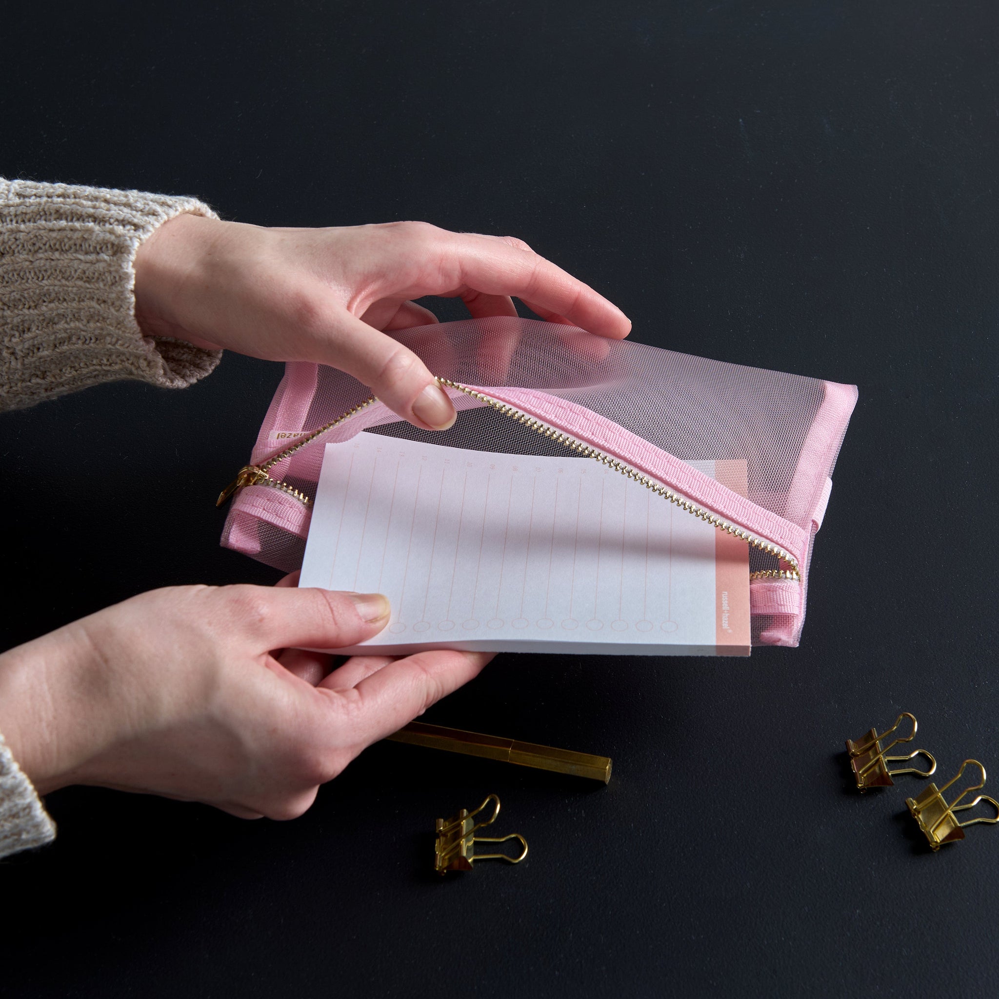 Adorn your signature binder with our pink and white mesh pencil and accessories case. A compact size of 8.5" x 5" this accessory holder has space for all your pens, pencils, and notecards. This mesh pencil holder is finished with gold toned hardware and an elastic band. Perfectly suited for our signature binder and A4 notebook collection, you can easily attach this posh pouch to your favorite cover for a tailored organization system.